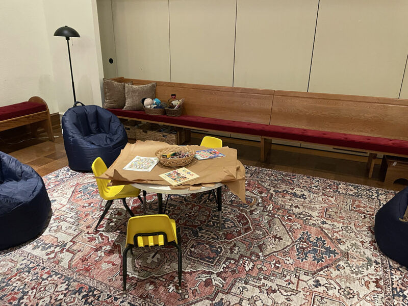 Our Soft Worship Space, located at the front right area of the Sanctuary, is available for all ages to engage their bodies in a way that allows them to be more present in worship.