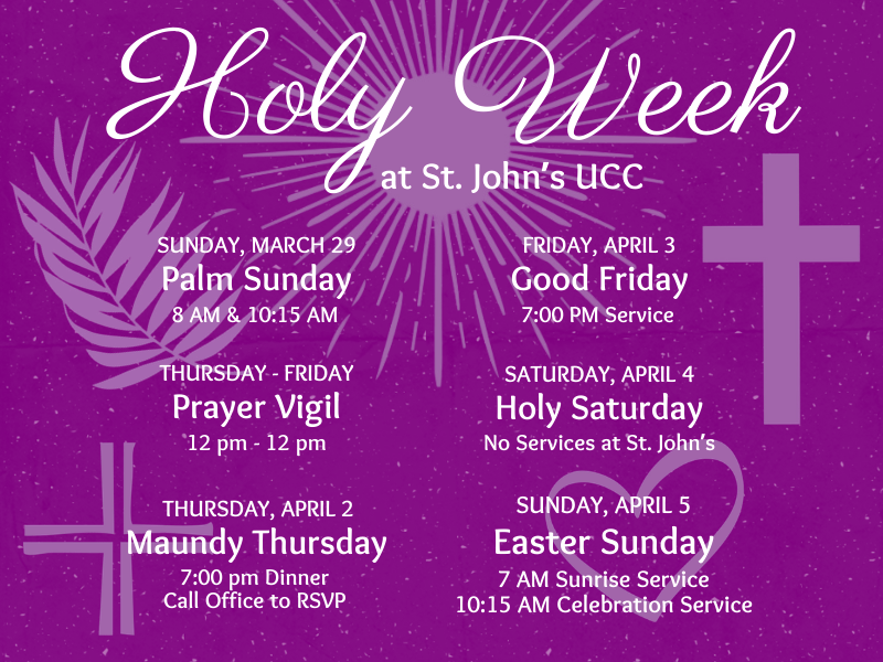 A sign-up chart with ½ hour prayer time slots will be posted in the Bulletin Board hallway and will include times that the St. John’s building will be open for prayer. Wishing you a blessed and reflective Holy Week! – St. John’s Elders