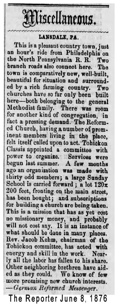 The German Reformed Messinger in 1876 wrote “Rev. Kehm has acted with energy and skill in his work. Nearly all the labor has fallen to his share. Other neighboring brethren have aided as they could. We know of few more promising new church interests.”