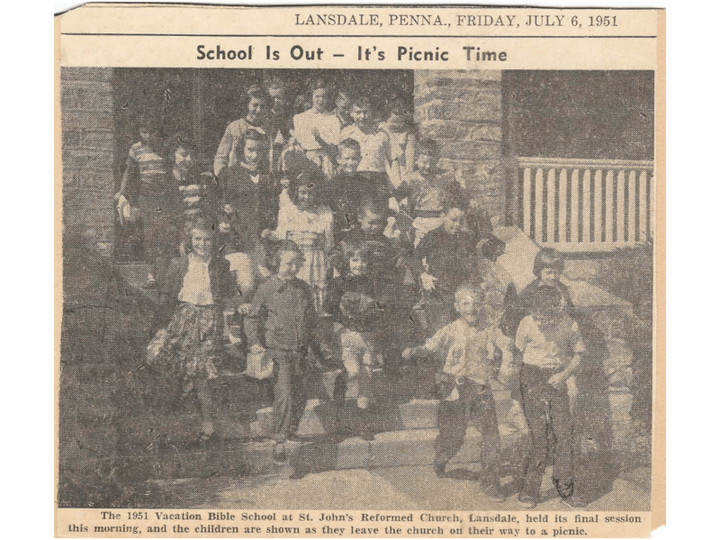image: photocopy of a July 6, 1951 newspaper photograph captioned “The 1951 Vacation bible School at St. John’s Reformed Church, Lansdale, held its final session this morning, and the children are shown as they leave the church on their way to a picnic.”